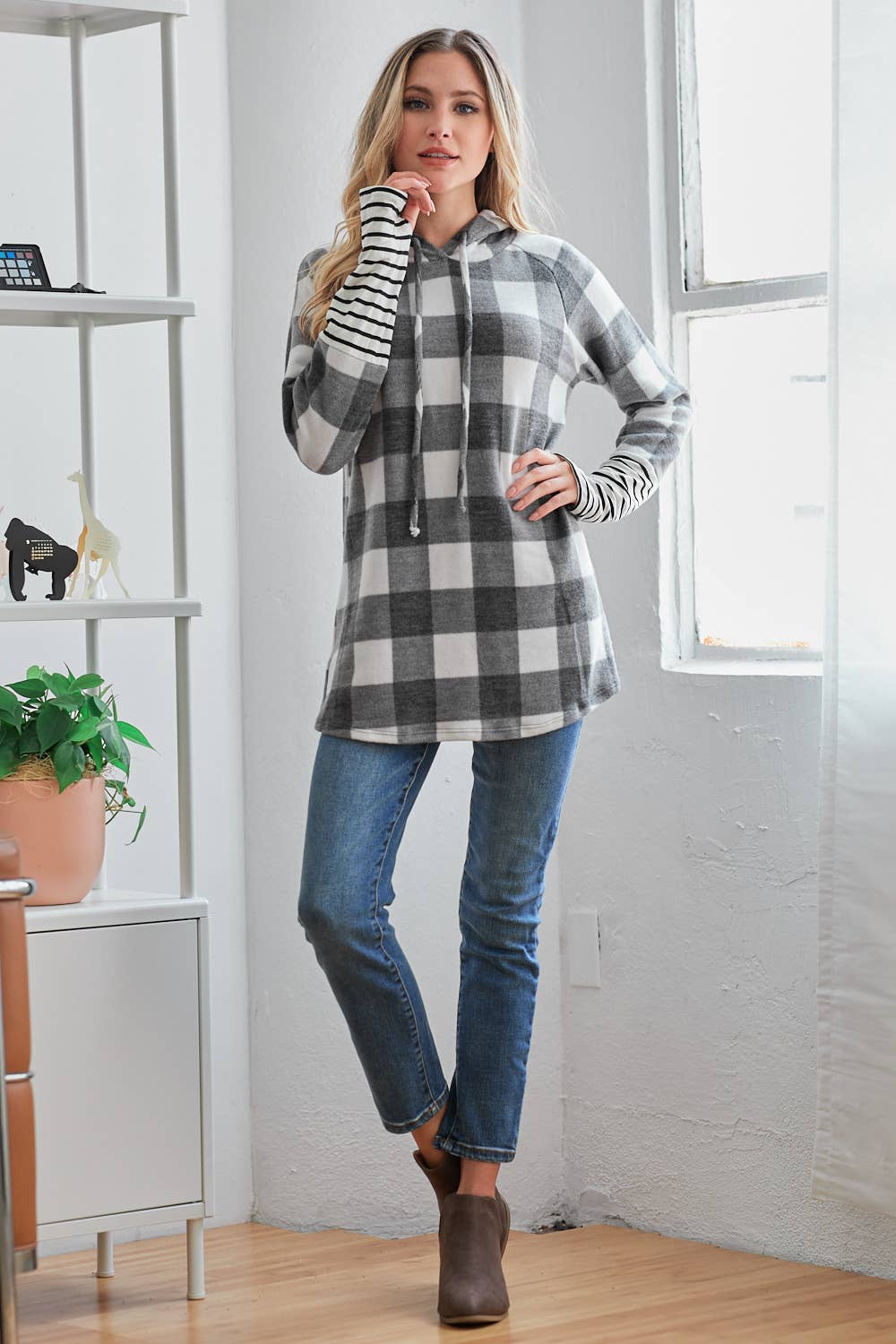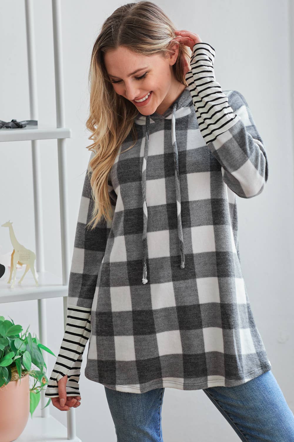 Long sleeve plaid hoodie with stripe contrast detail and thumb hole. This long sleeve top will make a great addition to your everyday outfit. Great for casual wear and made with high quality fabrics that are soft and very comfortable.